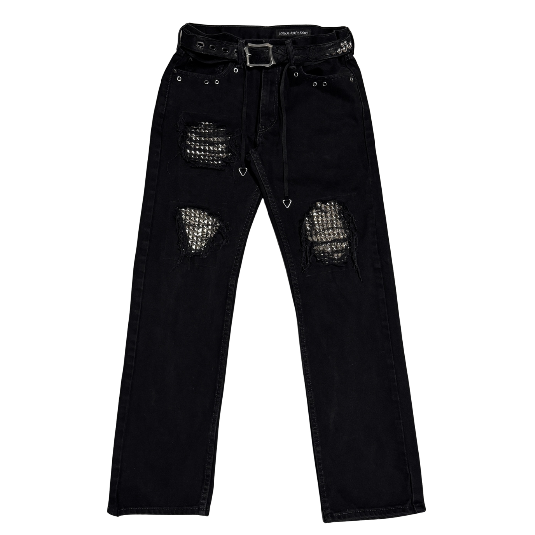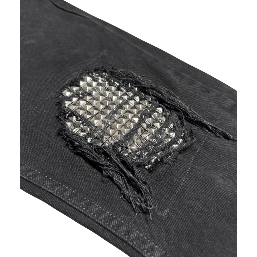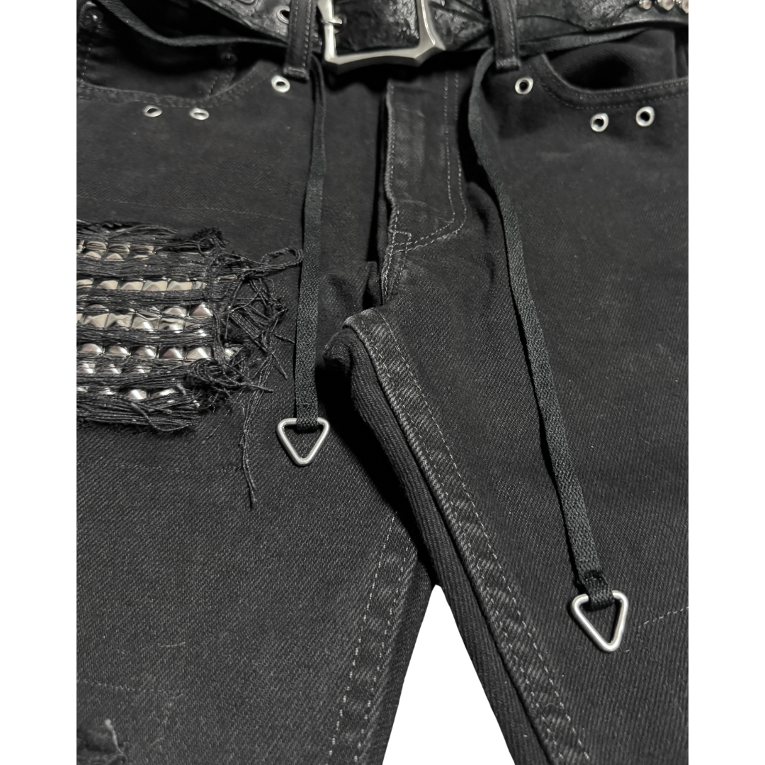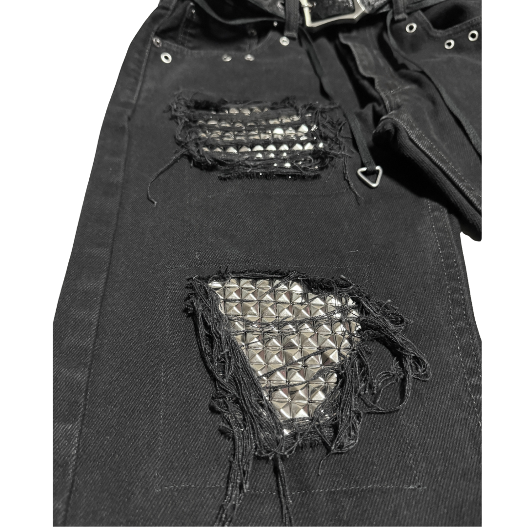 Tempus is built on the idea of scars becoming silver—every distressed hole reinforced with pyramid studs, every patch anchored by hand. Hardware and fabric merge into a record of labor and patience, a piece that carries the weight of hours spent bending metal and breaking denim.