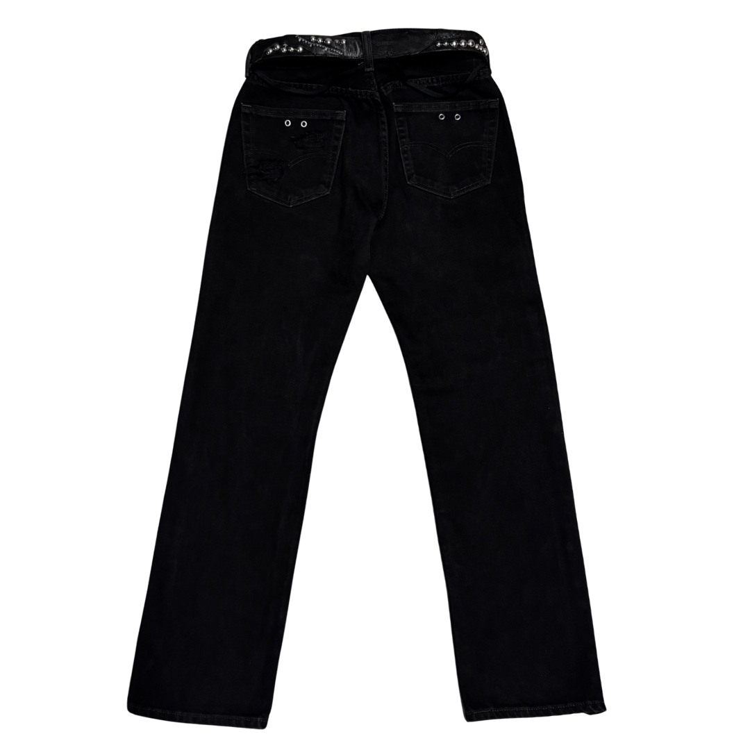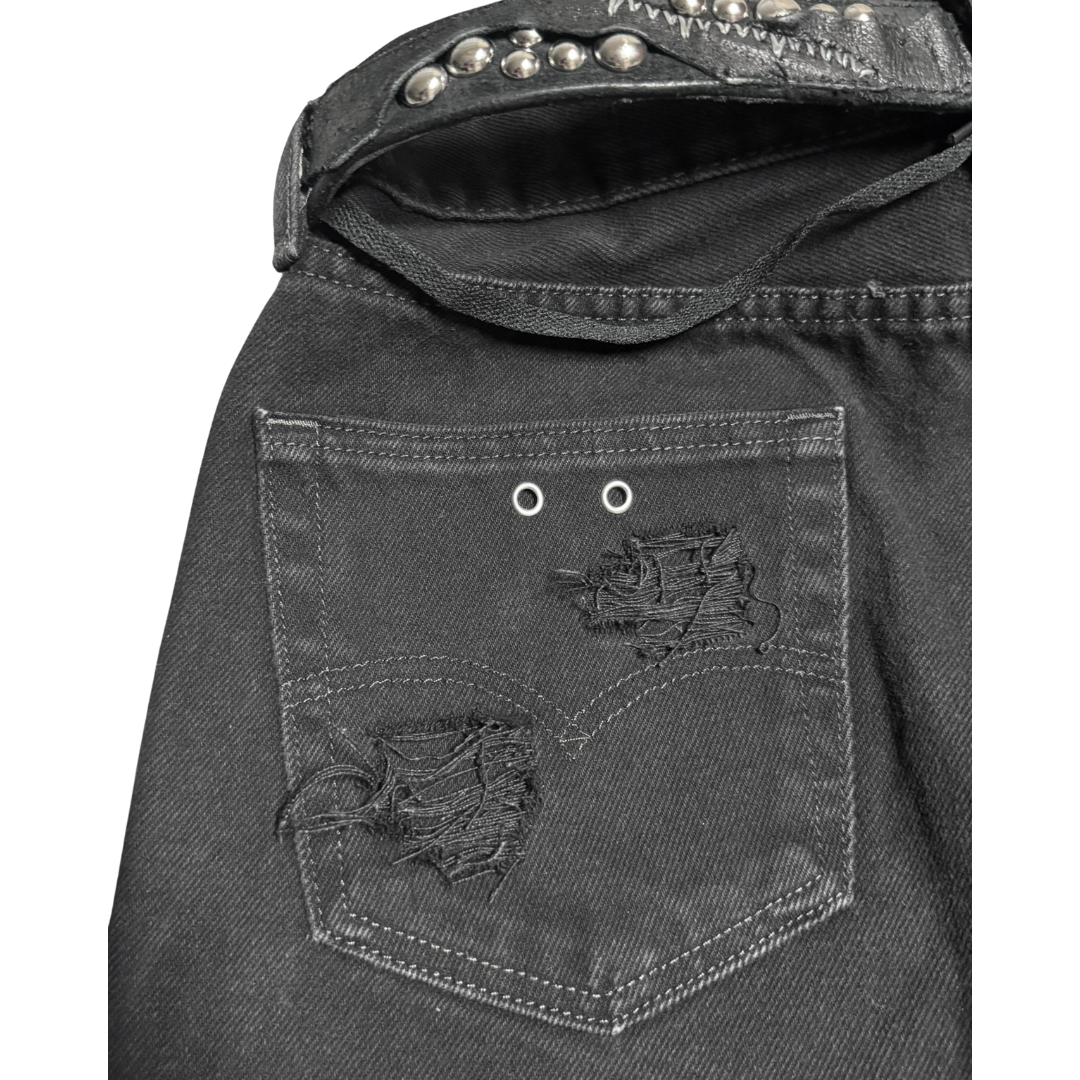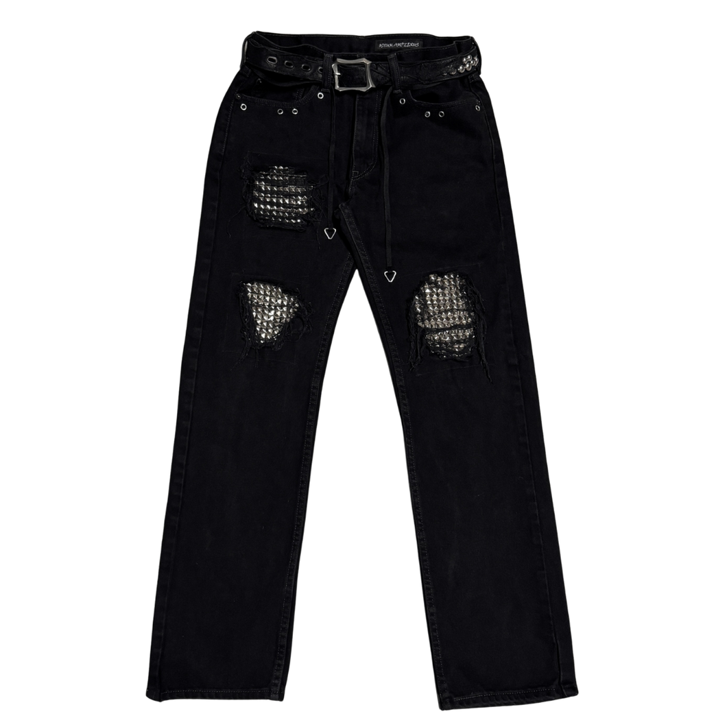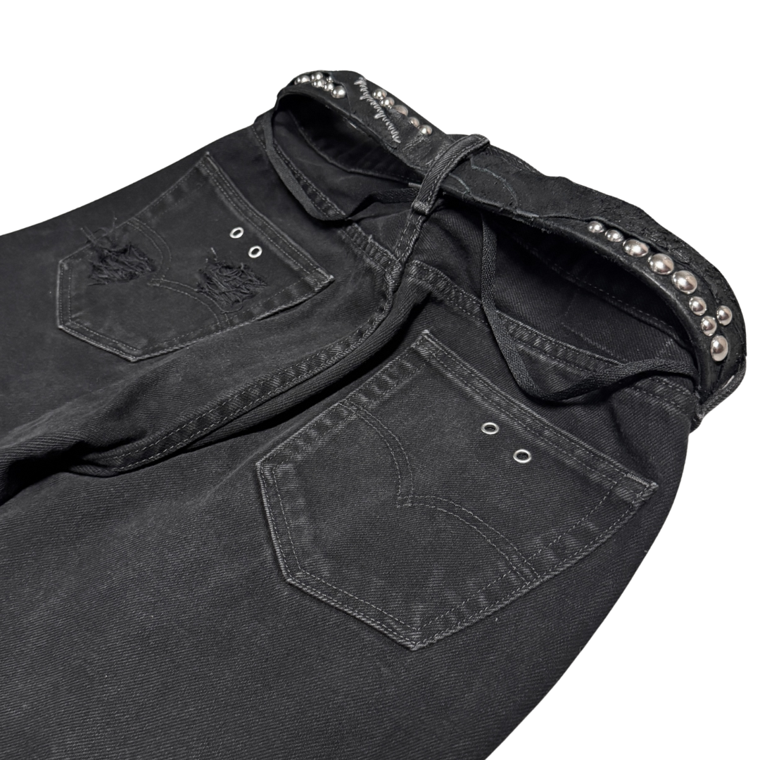 Tempus is built on the idea of scars becoming silver—every distressed hole reinforced with pyramid studs, every patch anchored by hand. Hardware and fabric merge into a record of labor and patience, a piece that carries the weight of hours spent bending metal and breaking denim.